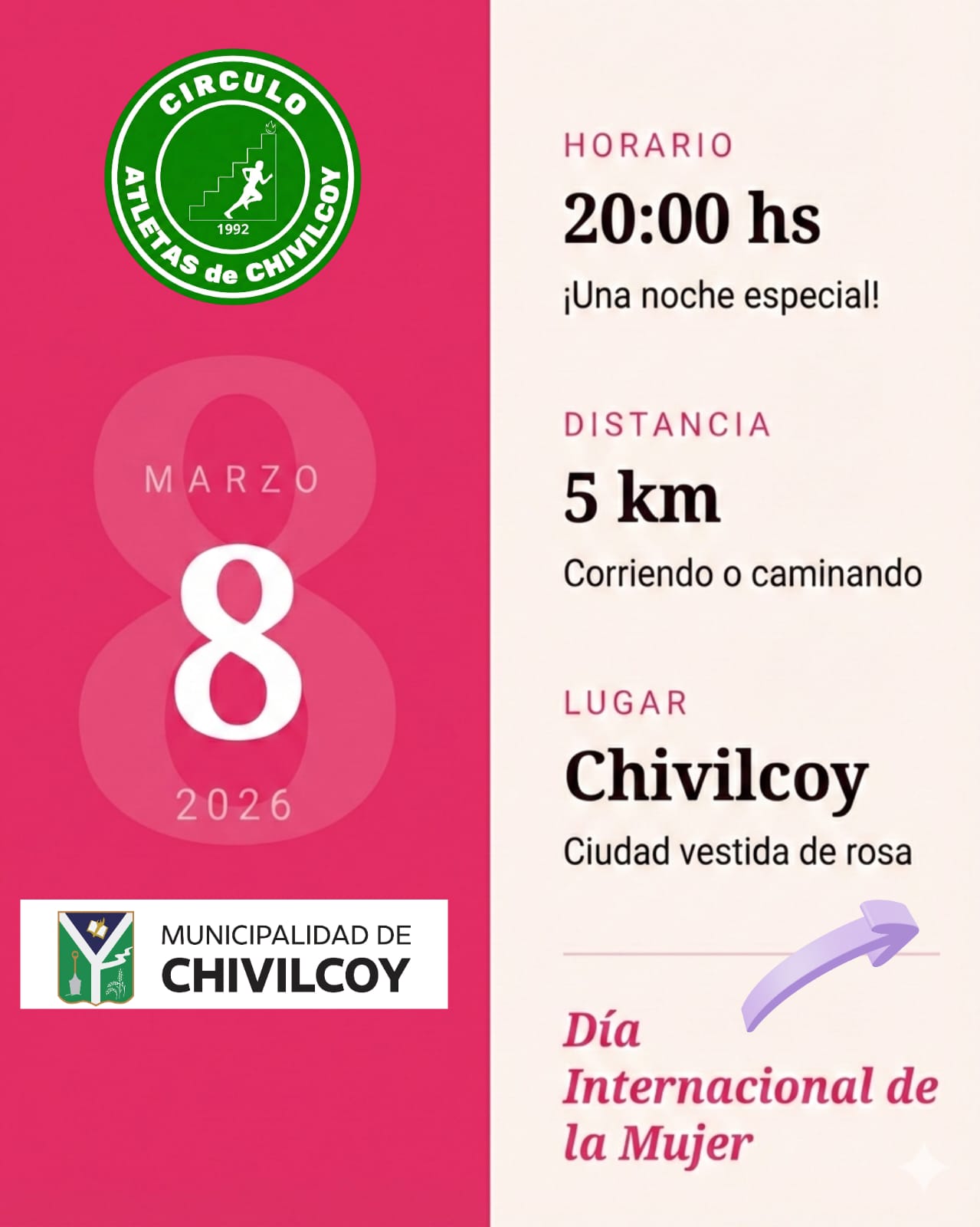Este domingo 8 de marzo Chivilcoy se viste de rosa con la Carrera de la Mujer 5K Valeria Trongé marzo 5, 2026 En el marco del Día Internacional de la Mujer, el próximo domingo 8 de marzo a […] Compartí en las redes